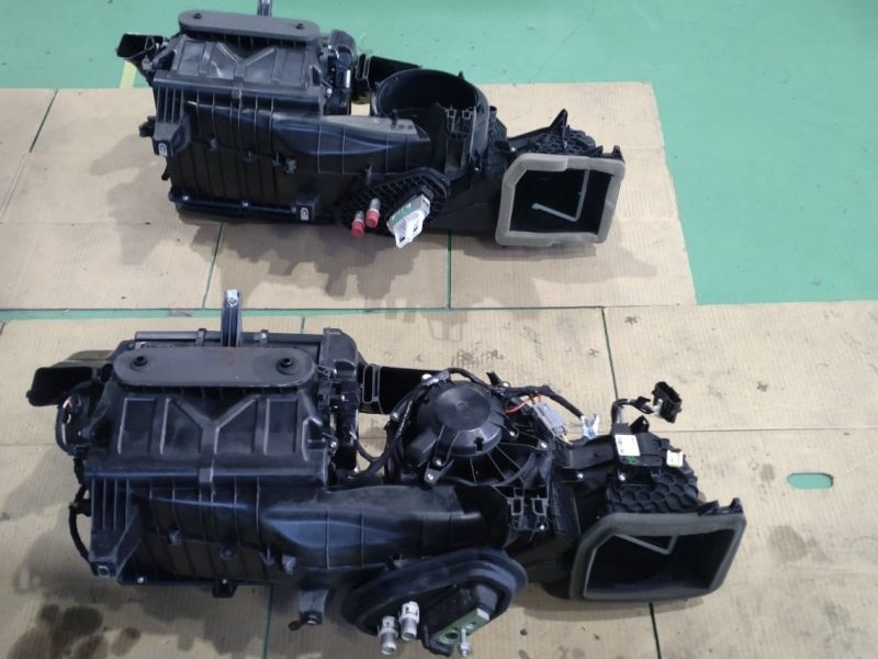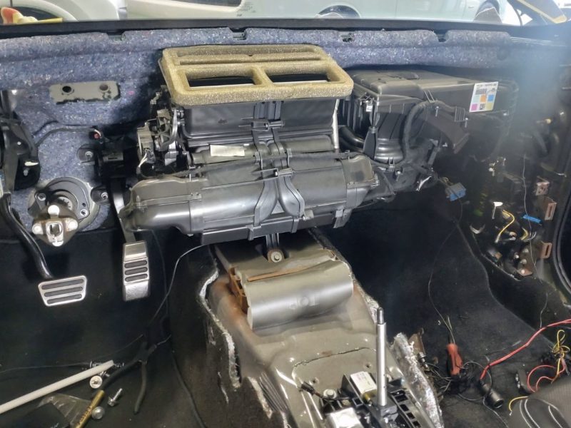マスタングのエバポレーターはケースユニットとし供給されているので、現車よりエアコンケースを取り外して新たなケースユニットへと組換え作業。