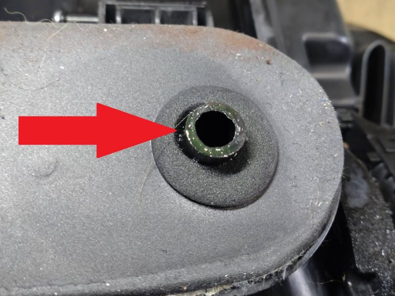 このリーク痕の発生源は、エアコンケース内の排水を行うドレンより漏れてきています。