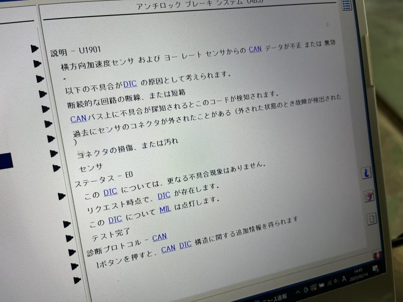 まず基本的な原因として確認されるDTC(故障コード)は、ヨーレートセンサーに対する不具合(U1901)を検知しています。