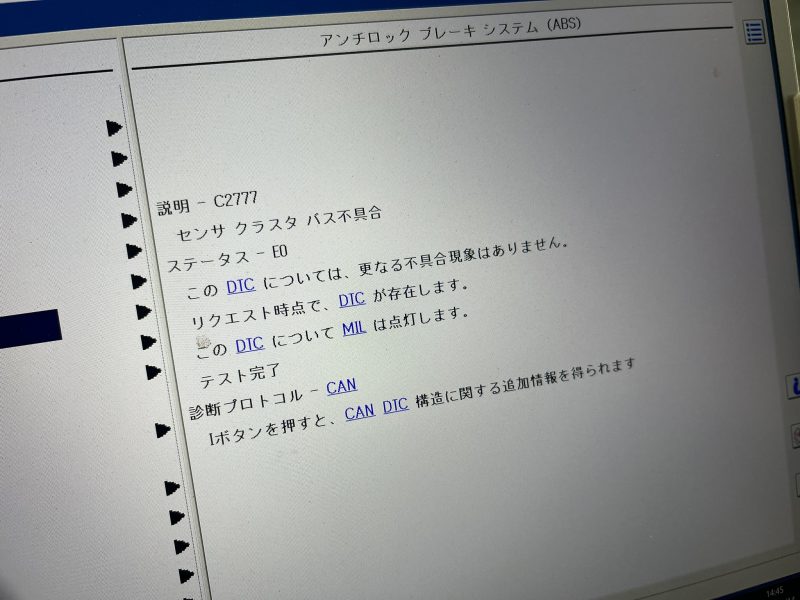 その為、ヨーレートセンサーは機能制御を行えず=CANデーター送信を行えないのでABSユニットが情報欠落により、ABS制御作動が行えない状態です。