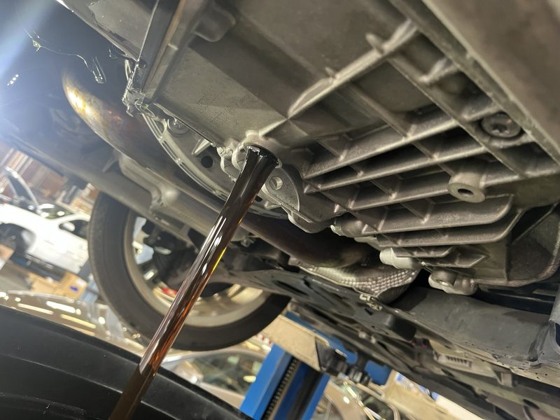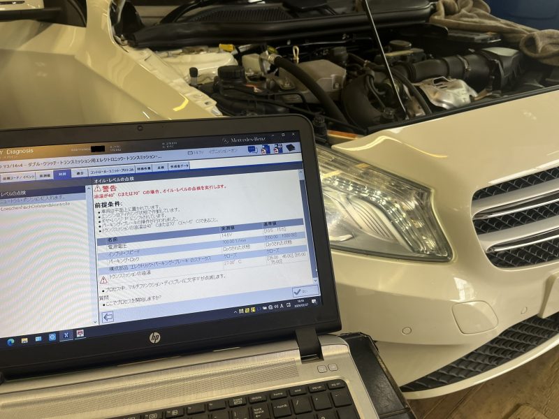 車検整備にてご入庫頂いたW176モデル/ベンツA180、ユーザー様のご希望でミッションフルードの交換メンテナンスを実施しました。