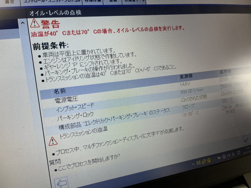 フルードのレベル調整を行う際は、XENTRYを接続して「フルードレベルの点検」プロセスを開始します。