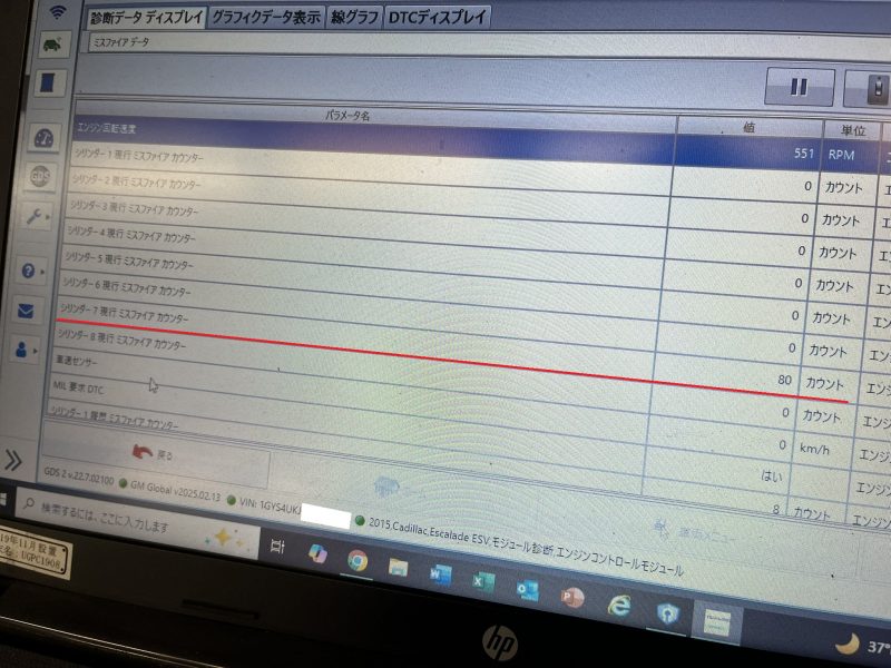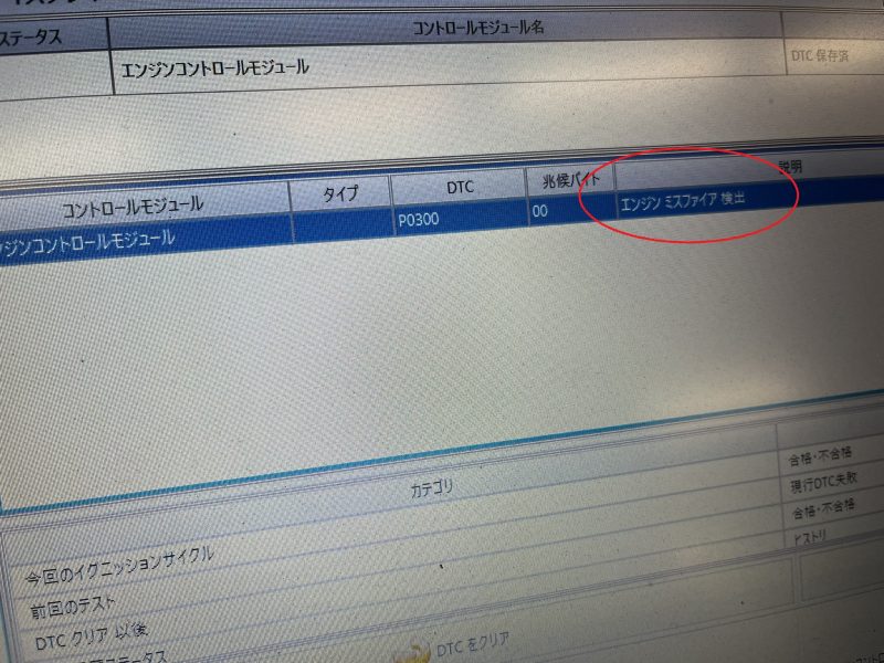 PCMのDTC(故障コード)を確認すると「P0300/エンジンミスファイア検出」が入力されており、失火カウンター実測を確認するとNo7シリンダーが常時失火状態に陥っています。