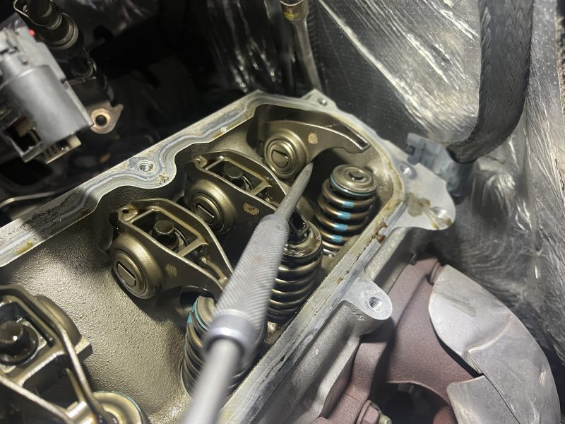 その打音は失火しているNo7シリンダーあたりの上部から聴きとれるので、バルブカバーを取り外して確認すると、案の定ロッカーアームに遊びが発生してEXバルブを駆動出来ない状態に陥っています。