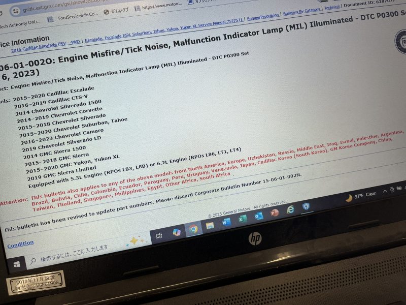 エンジンを始動すると「タンタンタン…」と打音が発生し、エンジンの調子も悪くて振動が発生してしまっている、2015yキャデラックエスカレードの修理作業です。