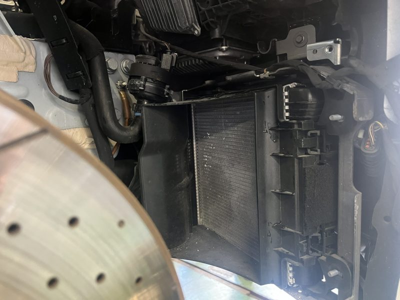 左側に装備されているラジエターはインタークーラー冷却用の低温ラジエターとなりますが、右側に装備されているラジエターはメインラジエターの補助となる高温回路で、今回はその右側高温補助ラジエターよりリークが発生していました。