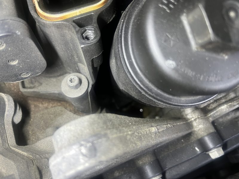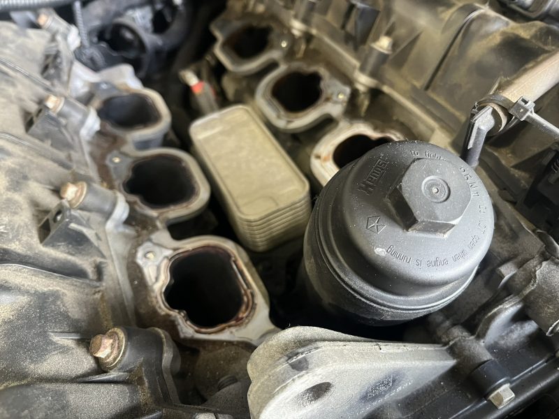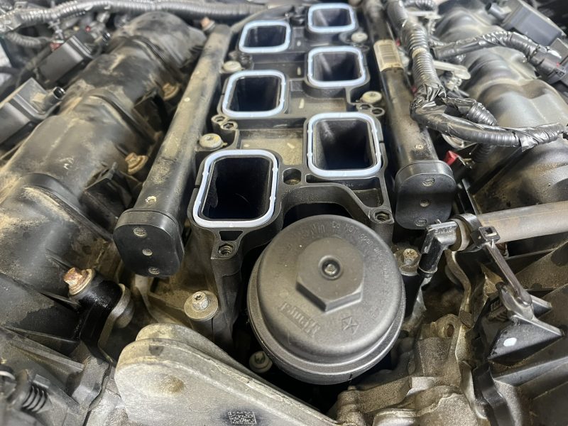 修理処置としてはインテークマニを取り外して、オイルエレメントハウジング部を交換することになり、3.6Lエンジンでは定番ともいえる弱点箇所となります。