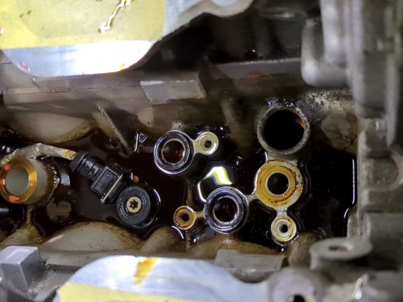 少し見難いですが、オイルエレメントハウジング部より覗き込むと、Vバンクにオイルが溜まっているのが確認できます。