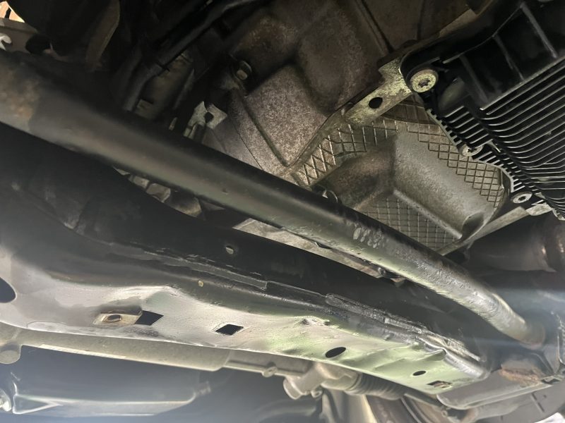 リフトに上げて確認すると、エンジンリア後方部より激しく漏れ垂れてきている痕跡が伺えます。