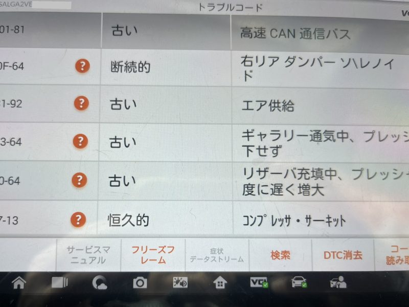 レンジローバーヴォーグはエアサスペンションシステムとなりますが、エアプレッシャーの不具合を促すDTC(故障コード)が数種検知されてしまっています。