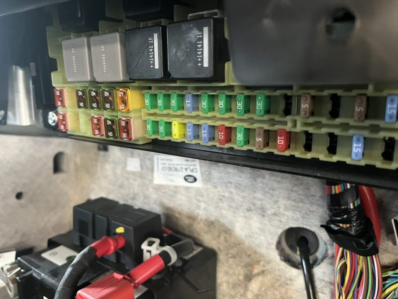 エアサスペンションスプリングにエアを供給するコンプレッサーの電源回路、具体的にはリレーや電源ヒューズ等を測定点検。