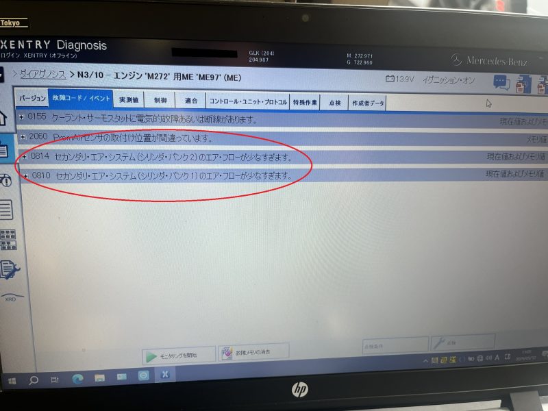 XENTRYテスターでのショートテスト結果では、セカンダリエアシステムのエアフロー過小検知により、先の警告ランプを点灯させてしまっているのが判明。