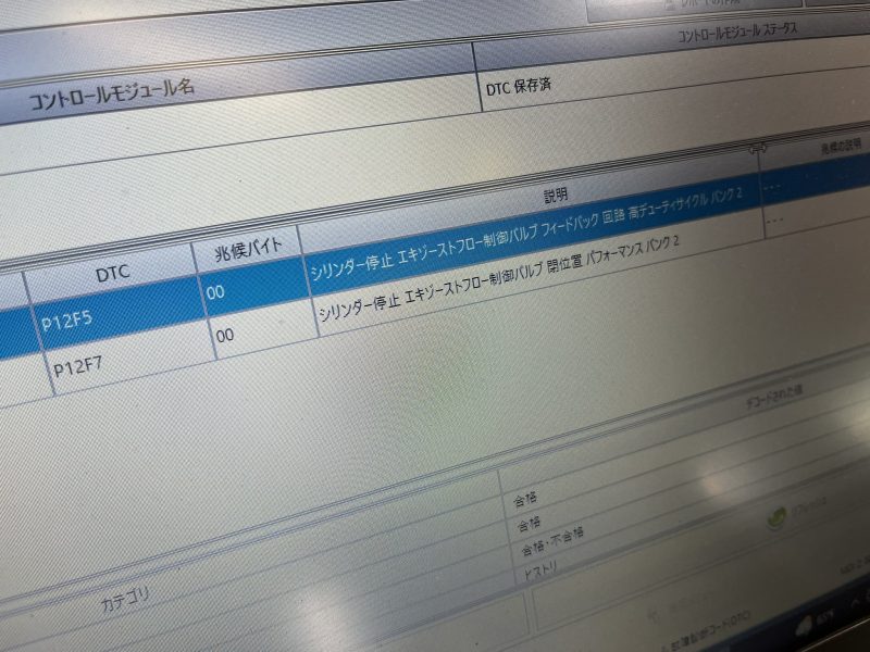 GDS2診断機にてモジュールのDTC(故障コード)を確認すると、バンク2側のシリンダー停止エキゾーストフロー制御バルブの不具合が、シャーシコントロールモジュールに検知されています。