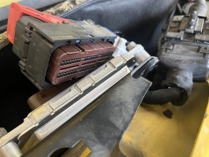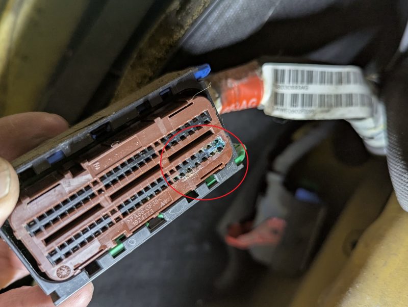 PCMが装着されている場所の水抜き等が不完全状態に陥ると、雨水等によりPCMが水没する…と予測できますが、今回の場合は上下あるPCM端子の下側には腐食は発生していません。