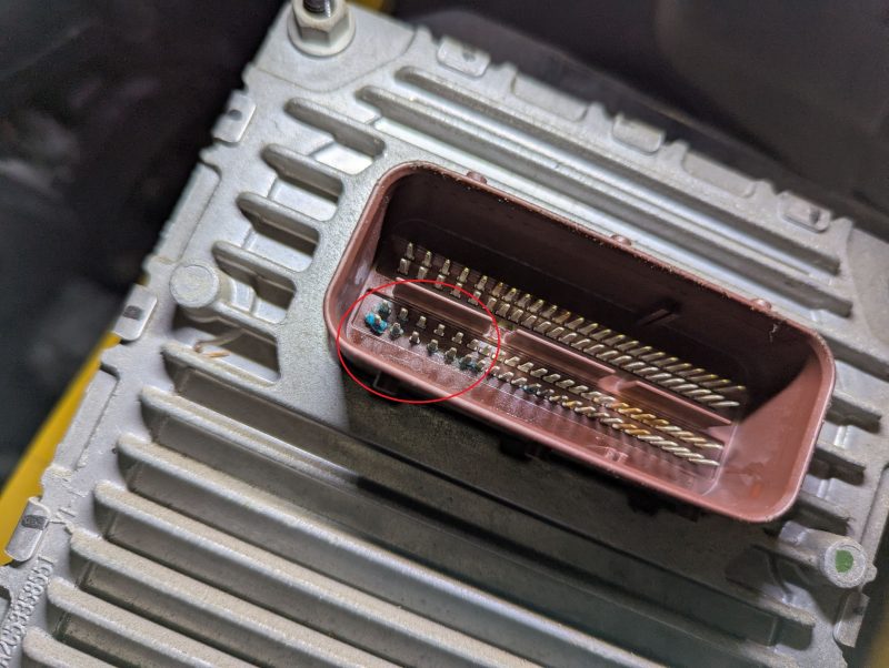 先日ご紹介した2012yダッジチャージャーのPCM水没損傷トラブル、PCM端子の一部に腐食損傷が発生している状態です。
