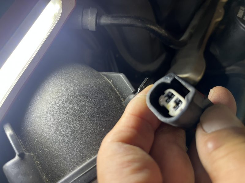 水温センサー側の端子をカプラーを取り外すと、クーラント(冷却水)で濡れてしまっている状態です。