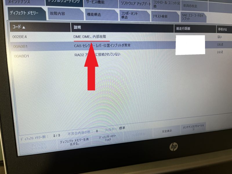 ISTA診断機にディフェクトメモリーを確認すると、「DME内部故障」が検知されており、そのDTCによってチェックエンジン警告も表示されてしまっています。