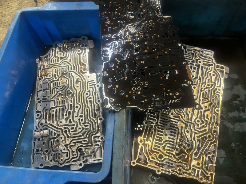 車両より降ろしたバルブボディより、TCM内蔵エレクトリカルプレートを分離します。