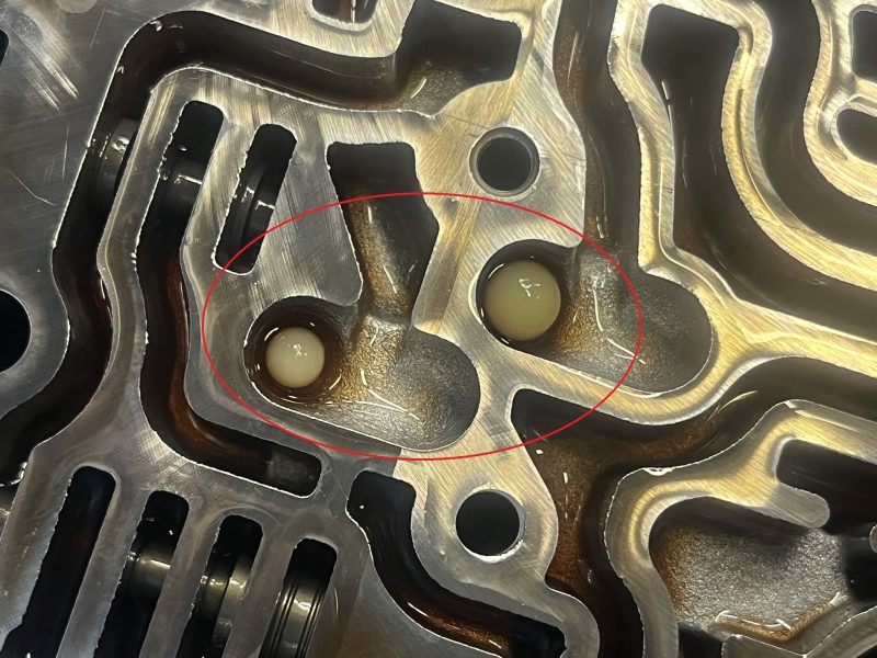 さらにバルブボディを分割すると、内部油圧通路の必要な箇所にチェックボールが存在していますが、その一部が摩耗によって小さくなってしまっているのが確認できます。