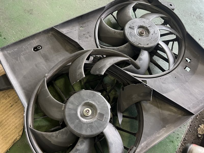 ラジエターの後方に装着されている電動式冷却ファンのブレードが、劣化やファンモーターの不良等により割れてしまい、その破片がラジエターに接触してラジエターコアを破壊してしまっています。