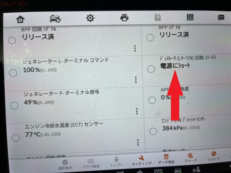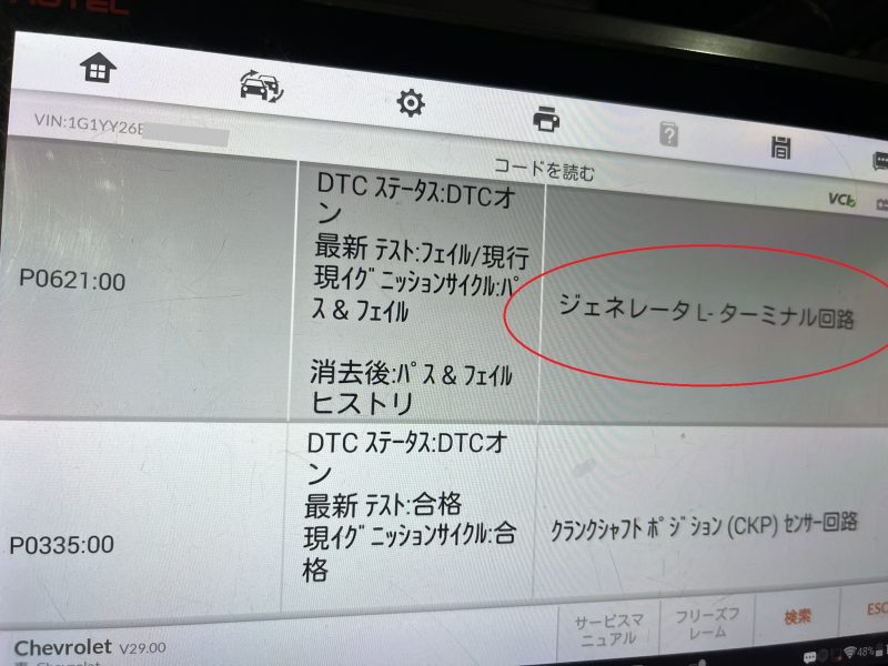 テスターでDTC(故障コード)を確認すると、ジェネレーターのLターミナル回路に対する不具合が検知されています。