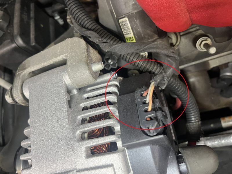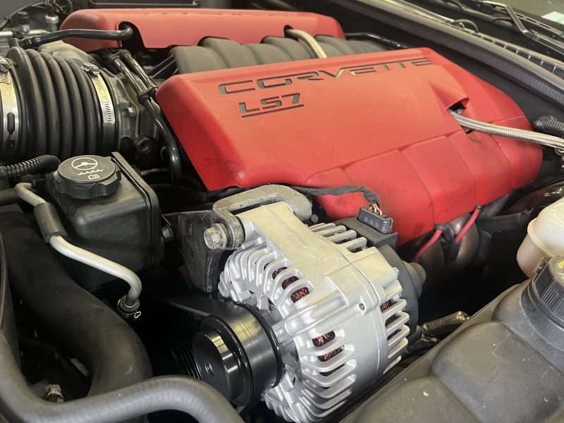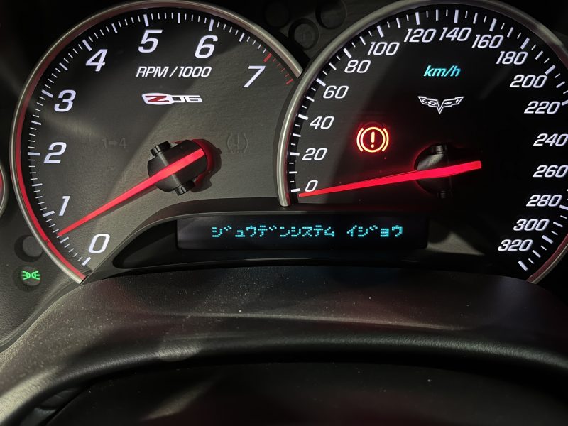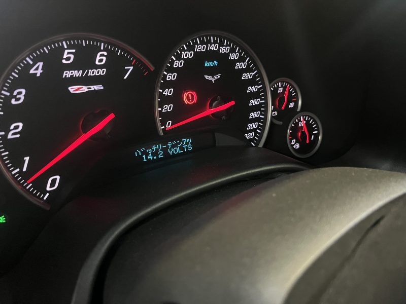 エンジン始動中に「充電システム異常」の警告メッセージが表示され、バッテリー電圧の低下症状が発生する、C6モデル/シボレーコルベットの修理作業です。