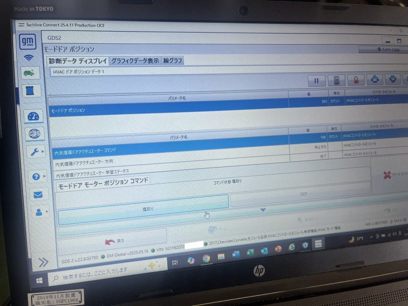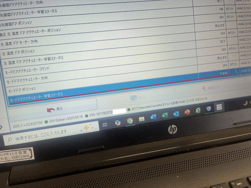 DTC的にモードドアアクチュエーターの固着トラブルと予測し、念のためモードドアポジションの再学習を試みましたが、アクチュエーター固着によって学習ステータスが不合格になってしまいます。