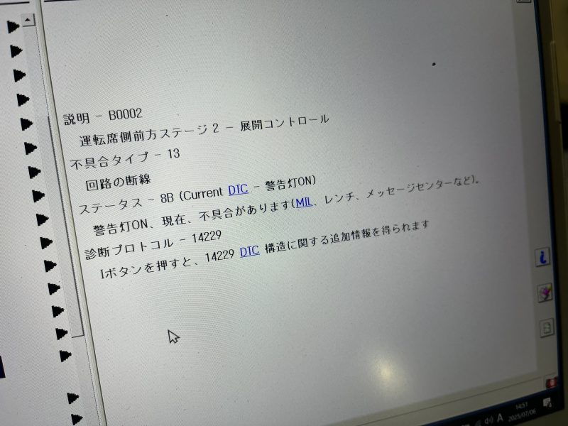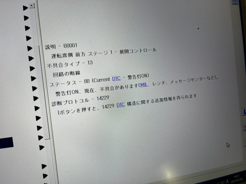DTC(故障コード)を確認すると、運転席エアバッグの展開コントロールが、ステージ1/2共に断線を検知しています。