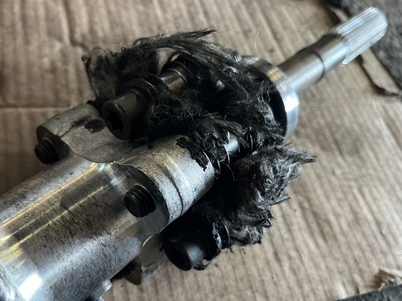 異音原因であるプロペラシャフトを取り外してみると、フロント側のカップリングジョイントの損傷が酷く、それによるガタが発生して異音トラブルへとなっています。