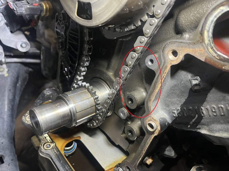 実はこのLCモデルのチャレンジャー/~2013yまでの5.7L/HEMIエンジンでは、金属製マウントが存在しない樹脂成型一体式のガイドレールが装着されており、今回のようにガイドレール摩耗等による破損トラブルを引き起こすと、タイミングチェーンがレール保持されずにエンジンに重大な損傷を与えてしまう危険性が存在します。
