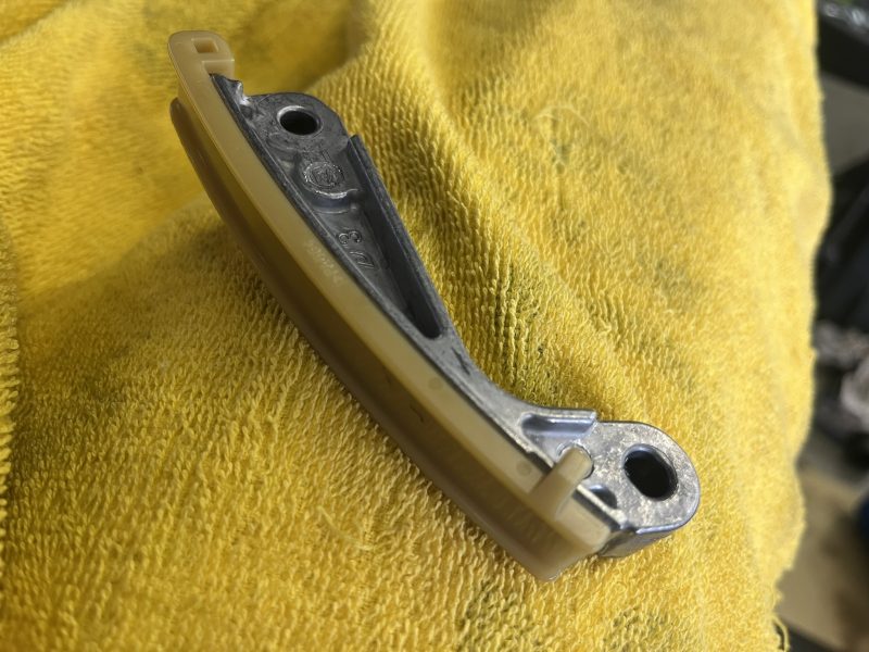 既存の樹脂製一体成型のものとは異なりアルミ製のレールマウントに樹脂製のガイドレールが形成されているので、今回のように摩耗/破損しても金属製ガイドレールマウントによりバルブタイミングトラブルも回避→エンジンの重大な損傷トラブルも未然に防げる確率が上昇します。