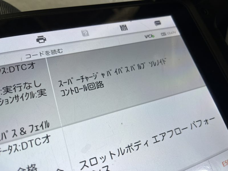 DTC(故障コード)を確認すると、スーパーチャージャーのバイパスバルブソレノイドコントロール回路に対するエラーが検知されてしまっています。