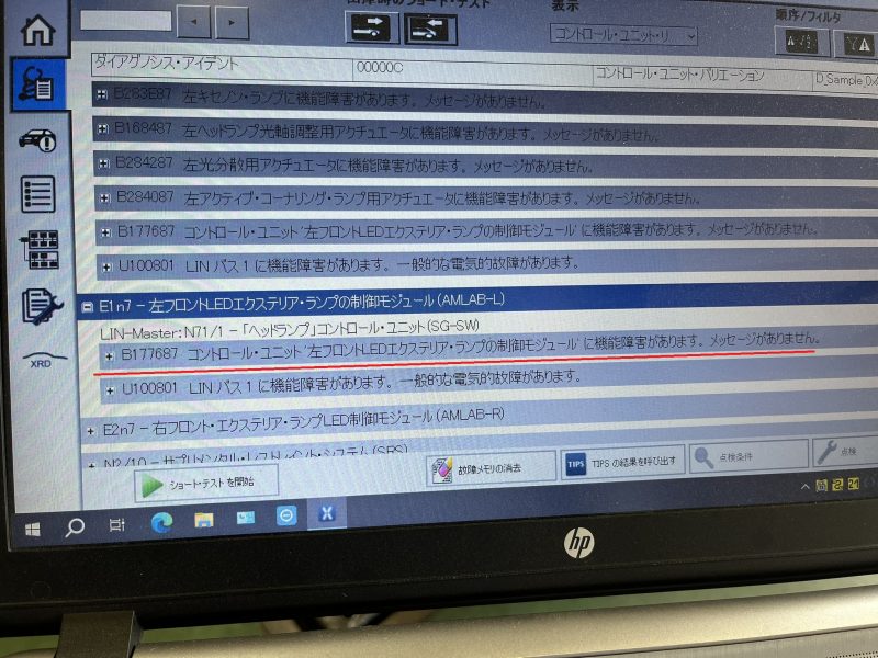 XENTRY診断機にてショートテストを行うと、不具合が発生している左側のフロントLEDエクステリアランプ制御モジュールの機能障害が検知されてしまっています。
