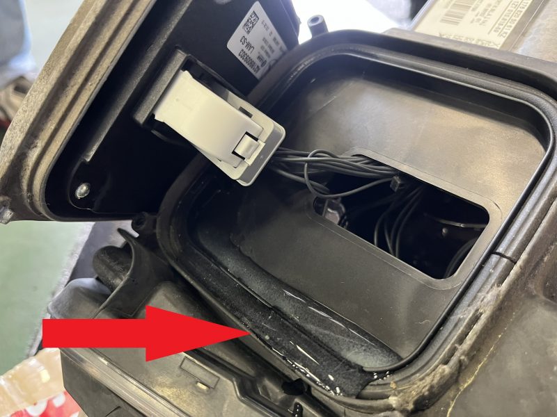 問題のヘッドライトを現車から取り外してLEDエクステリアランプ制御モジュールを確認すると、その取付部より水が混入してしまっているのが判明。