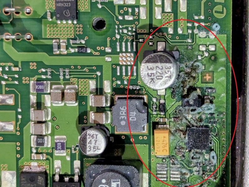 制御モジュール取り付け面パッキンの劣化等によって雨水や洗車水が侵入し、モジュール内部が腐食してしまっている状態に陥っています。
