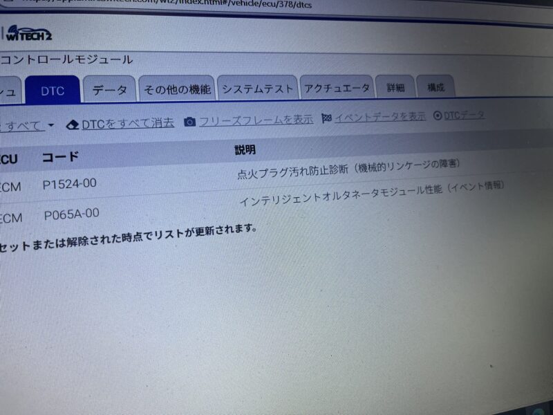 wiTECH診断機を接続してDTC(故障コード)を確認すると、「点火プラグ汚れ防止診断」と説明されるエラーコードを検知されている状態です。