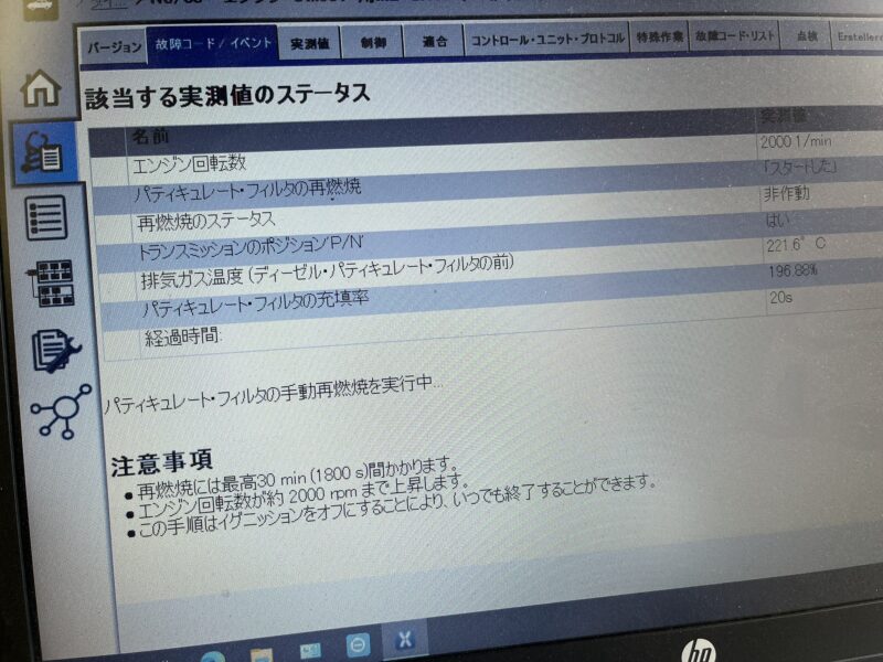 上記DTC検知により再燃焼制御が遮断されてしまっているので、XENTRY診断機を使用してDPFの手動再燃焼プロセスを実行します。