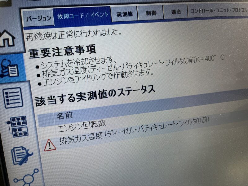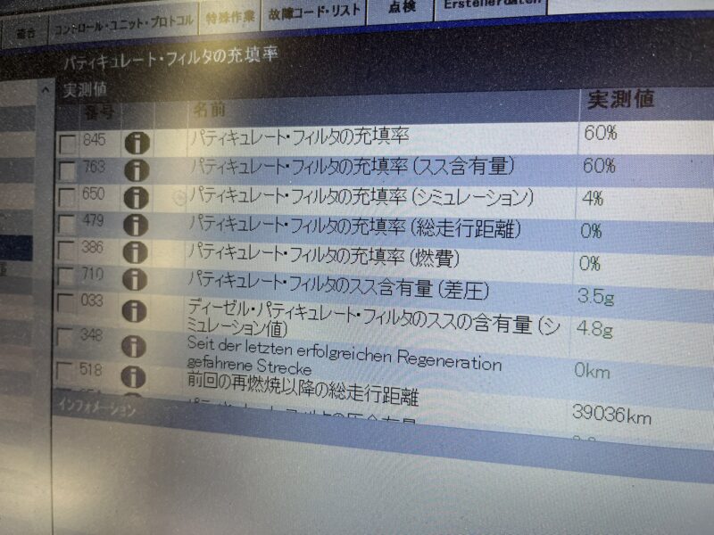 しかし現車は排気ガス温度センサーの機能障害等により、DPFの充填率が基準値より高すぎる数値を示してしまっています。