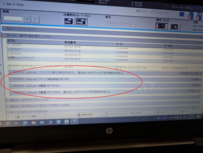 XENTRY診断機にてDTCを確認すると、SCRシステムにてAdBlueシステムのリークを疑うエラーが検知されています。