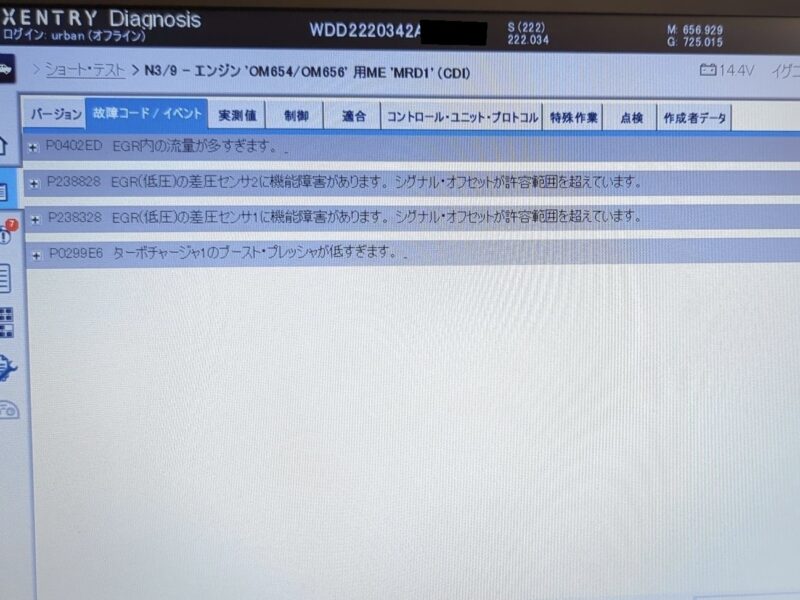 XENTRY診断機にてショートテストを行うと、EGRの差圧センサーに対する機能障害が検知されています。