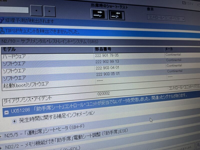 XENTRYによるショートテストにてSRSのDTC(故障コード)を確認すると、助手席シートのコントロールユニットが妥当でないデータ受信によるものと判明。