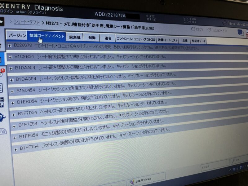 更に助手席側シートのコントロールユニットのDTCを確認すると、シートポジションに対するキャリブレーションが消失してしまっているのが判明。