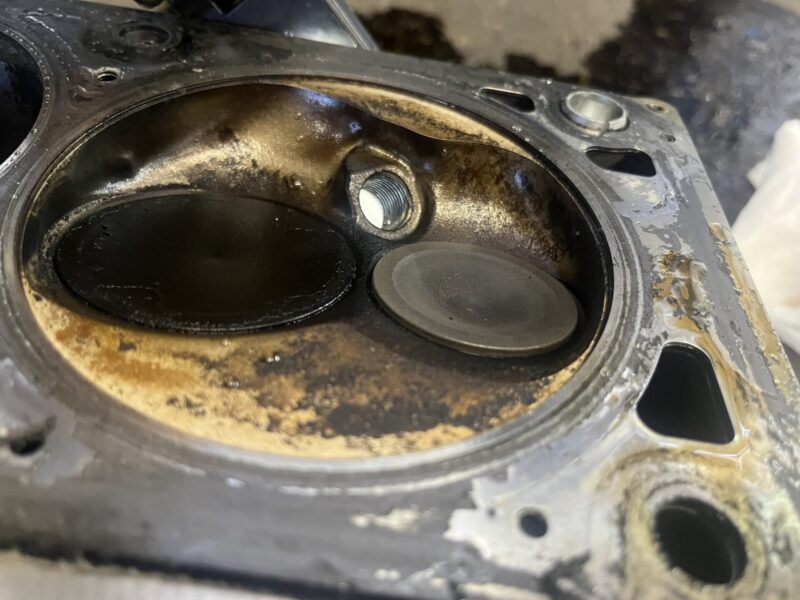 インテークバルブがリフトされているので圧縮圧力が保てないのは明白ですが、シリンダーヘッドを取り外して確認するとリフトしていたバルブは綺麗に閉じており、バルブフェイスの欠けやステムの大幅な曲がり等は診うけられません。