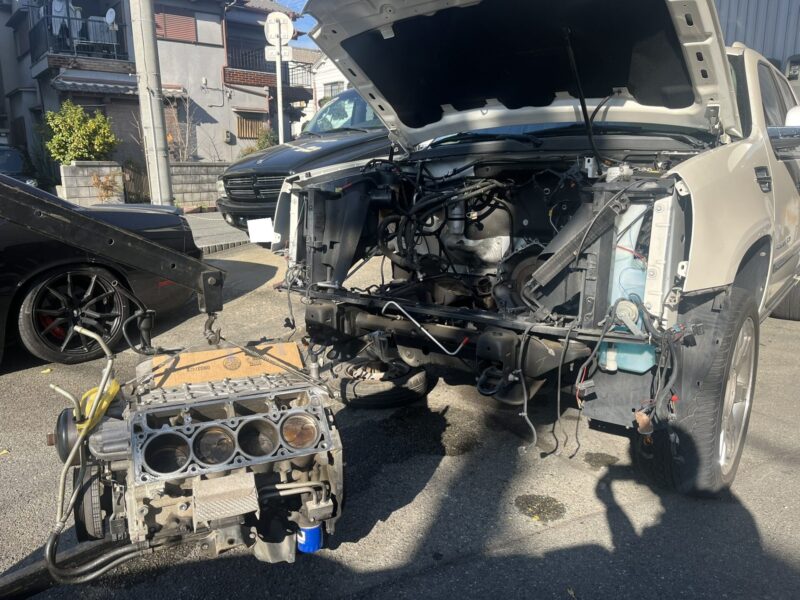 上記内容によりエンジンブロック側損傷ダメージが診うけられるので、USAよりリビルトエンジンを業者様の方で手配していただき、エンジンの載せ替え作業という大掛かりな作業内容となりました。