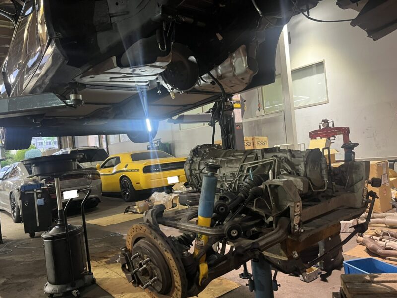 アクセスするにはミッションアクスルが邪魔となるので、必然的にリアアクスルメンバーを車両より取り外す作業となります。