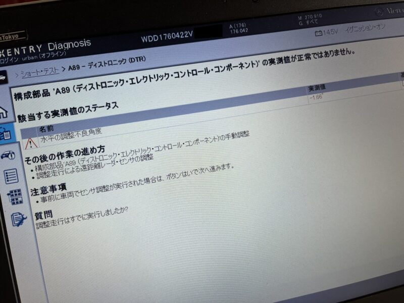 DTC(故障メッセージ)を確認すると、DTR(ディストロニックエレクトリックコンポーネント)の水平調整角度の実測値が、基準値外にあります。