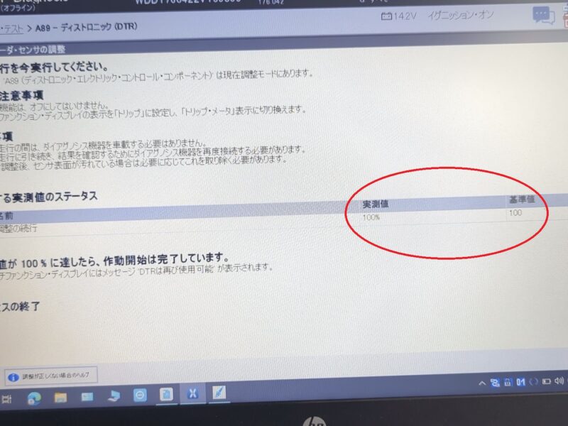 その後XENTRYにて調整走行プロセスを実行し、実測値が100%に満たせば作動開始状態が完了となり、先の警告表示トラブルも解決となります。