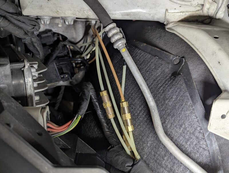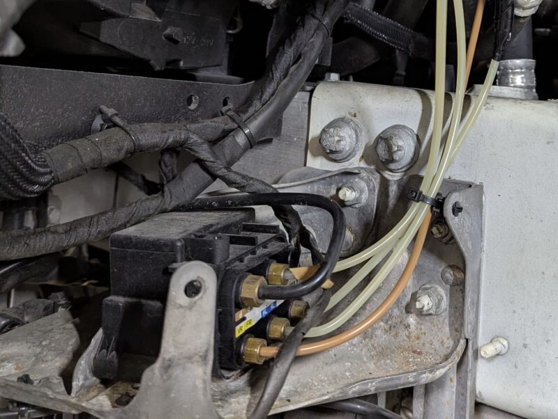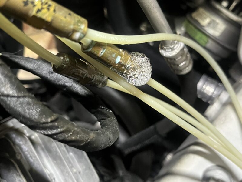 アナログ的に石鹸水を使用してリークテストを行うと、バルブブロックから右フロントストラットへ導かれるラインのジョイントからエア漏れが発生しているのが判明。