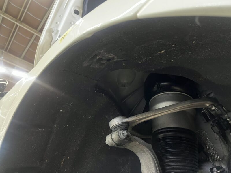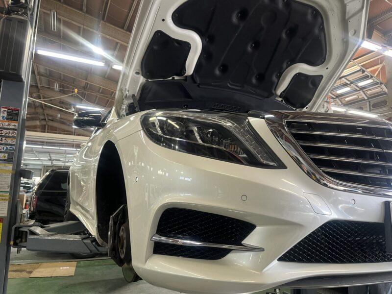 数日駐車していると右フロントの車高が下がってしまう、W222モデル/ベンツS550の点検/修理作業です。