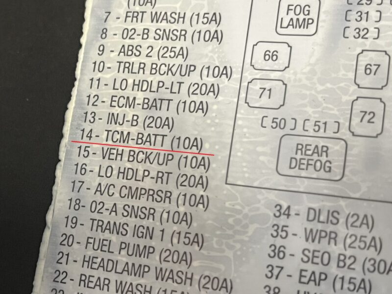 今回のエスカレードではNo14の10Aヒューズを抜くと漏電が解消されるのが判明、ヒューズケースに表記されているグループ名称は「TCM-BATT」となっています。